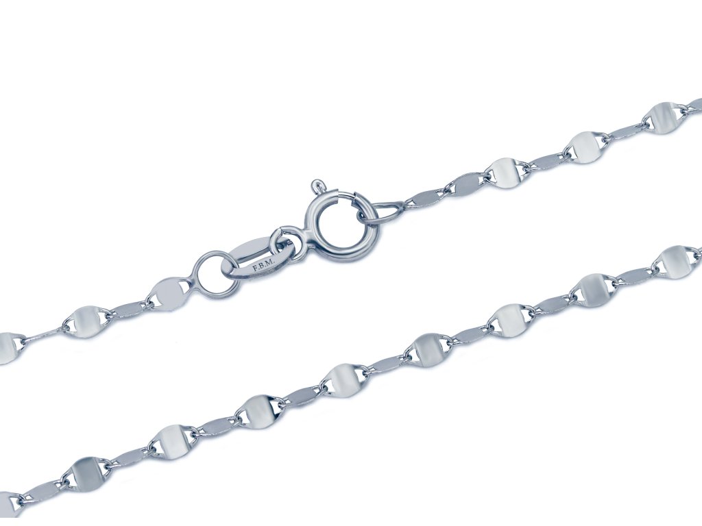 Řetízek z kvalitního bílého zlata o ryzosti 585/1000, Specifická do sebe zapadající očka s broušenou destičkou uprostřed (Tloušťka: 0.08 mm)