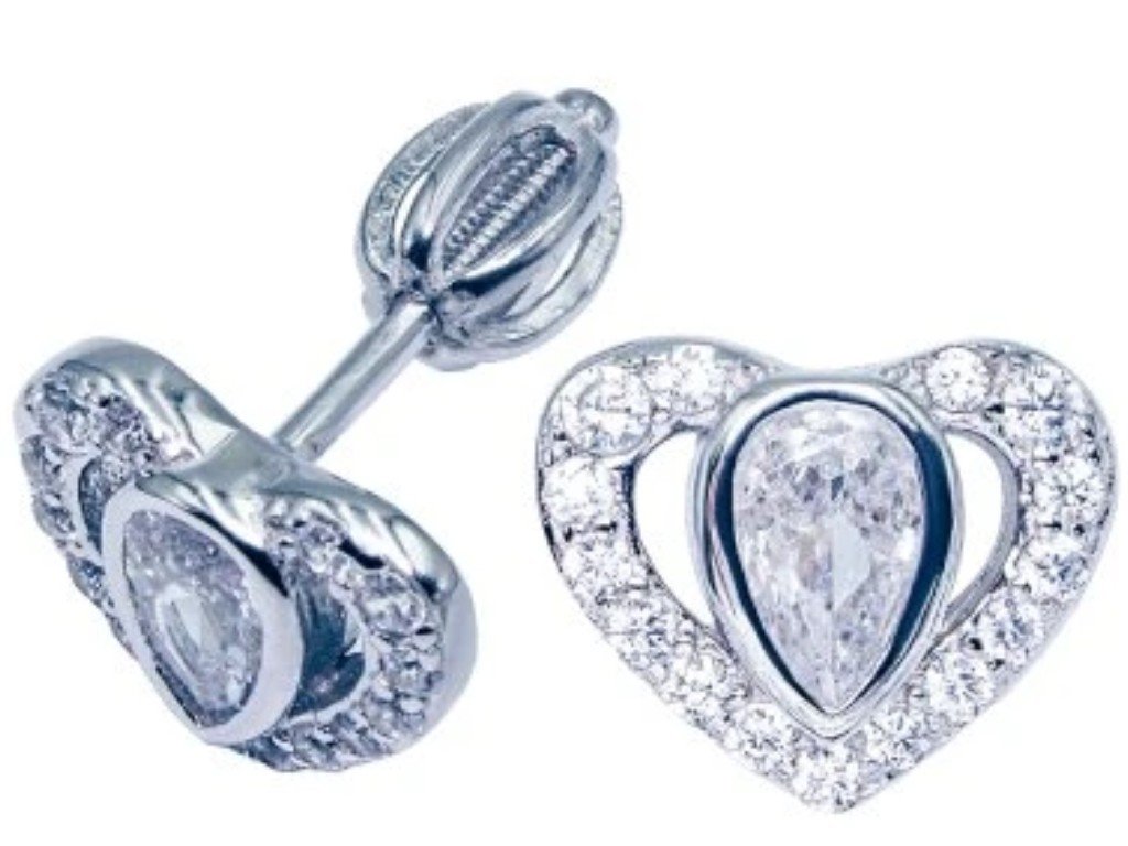 Náušnice z kvalitního stříbra o ryzosti Ag 925/1000 s příměsí Rhodia - s romantickou tématikou - srdce a zirkony - Zamilujete si je na první pohled. Střed náušnice tvoří zirkon ve tvaru Pear -hrušky- a obklopují jej zirkony briliantového brusu kulatého tvaru, díky kterým vypadají náušnice jako honosný královský šperk.