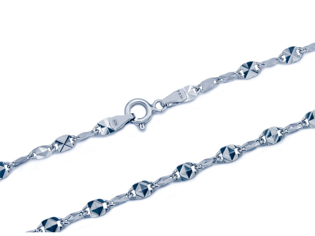 Řetízek z kvalitního stříbra o ryzosti Ag 925/1000 s příměsí Rhodia,délce 40 cm a šířce 3.46 mm - typický znak: skládá se ze spojených oček dekoračně vybroušených do nejrůznějších motivů - velice moderní lesklá záležitost, která rozveselí každou něžnou duši